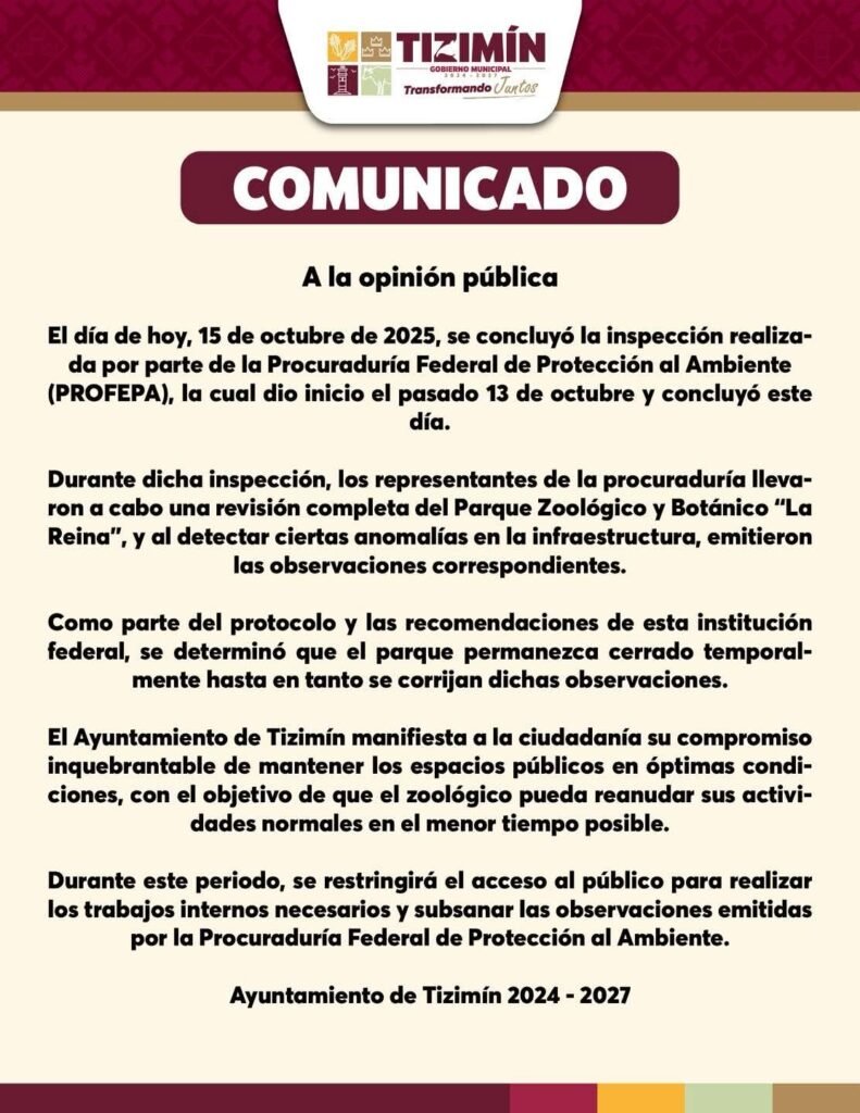 Tizimín, Yucatán.- Las denuncias de maltrato y abandono animal en el Zoológico “La Reina” de Tizimín obligaron la intervención de la Procuraduría Federal de Protección al Ambiente (Profepa).