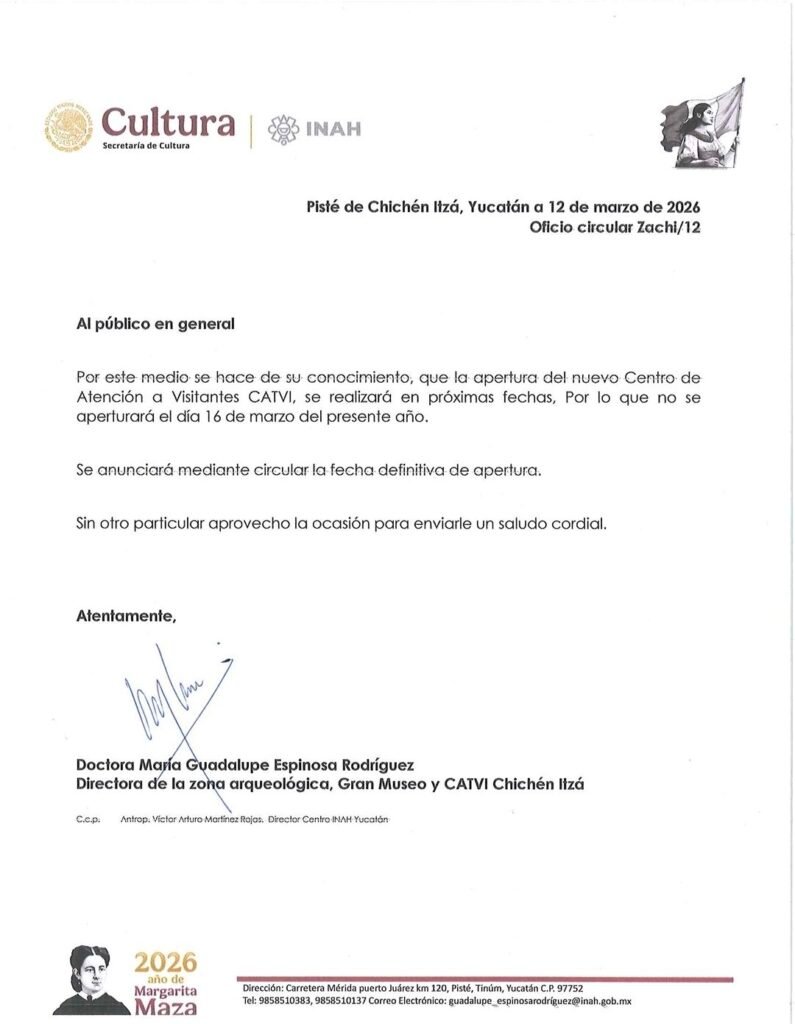 Pisté, Yucatán.- A tres días de la fecha anunciada para la inauguración del Centro de Atención a Visitantes (CATVI) de Chichén Itzá, la administración de la zona arqueológica oficializó el aplazamiento.