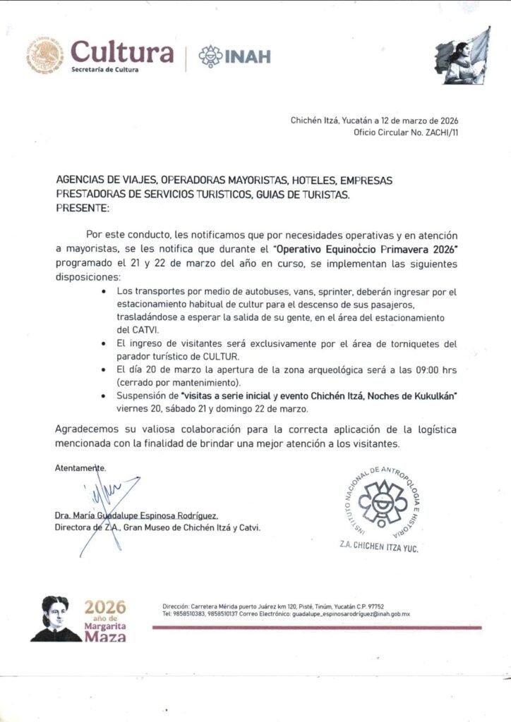 En otra circular, también se notificó a las empresas del sector y trabajadores independientes de cambios parciales en el flujo de paseantes durante el “Operativo Equinoccio Primavera 2026” los días 21 y 22 de marzo.