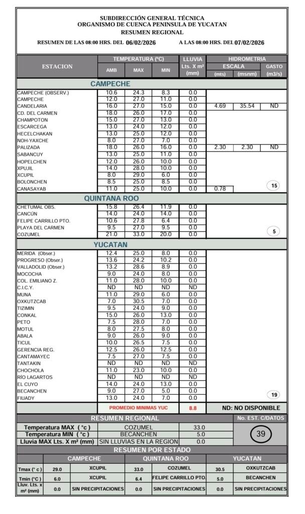 Por su parte, el Organismo de Cuenca Península de Yucatán (OCPY) informó que la mínima regional este 7 de febrero es de 5.0 grados en Becanchén, municipio de Tekax, Yucatán.