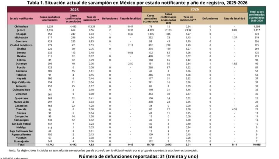 Lamentablemente, hay 31 defunciones por sarampión, distribuidas en ocho estados, de las cuales 21 son de Chihuahua, el 67.74 por ciento, tres de Jalisco, el 9.68 por ciento; dos de Durango, el 6.45 por ciento, y uno en la Ciudad de México, Chiapas, Michoacán, Sonora y Tlaxcala, el 3.57 porcentual, respectivamente.