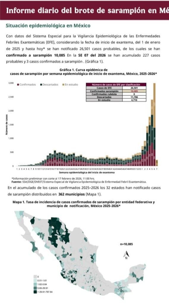 Con el conteo del Sistema Especial para la Vigilancia Epidemiológica de las Enfermedades Febriles Exantemáticas (EFE), hasta hoy se notificaron 26 mil 501 casos probables, de los cuales 10 mil 85 se confirmaron a sarampión.