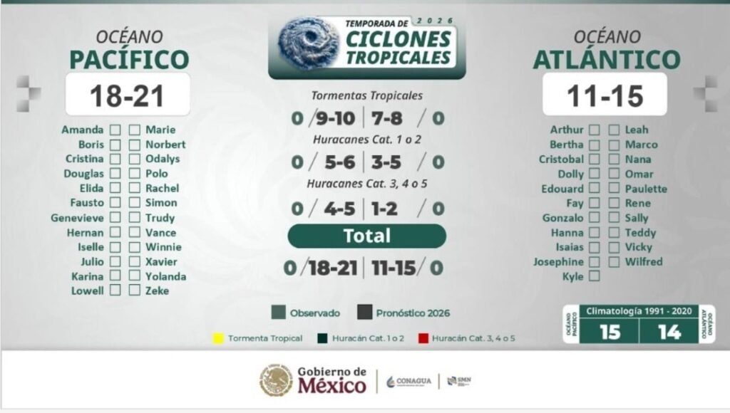 Respecto a la actividad ciclónica, indicó que para la temporada 2026 se pronostica una mayor actividad en el océano Pacífico, con condiciones por arriba del promedio, mientras que en el Atlántico se prevé una actividad cercana o por debajo de lo normal. Explicó que este comportamiento es consistente con el desarrollo del fenómeno de El Niño.