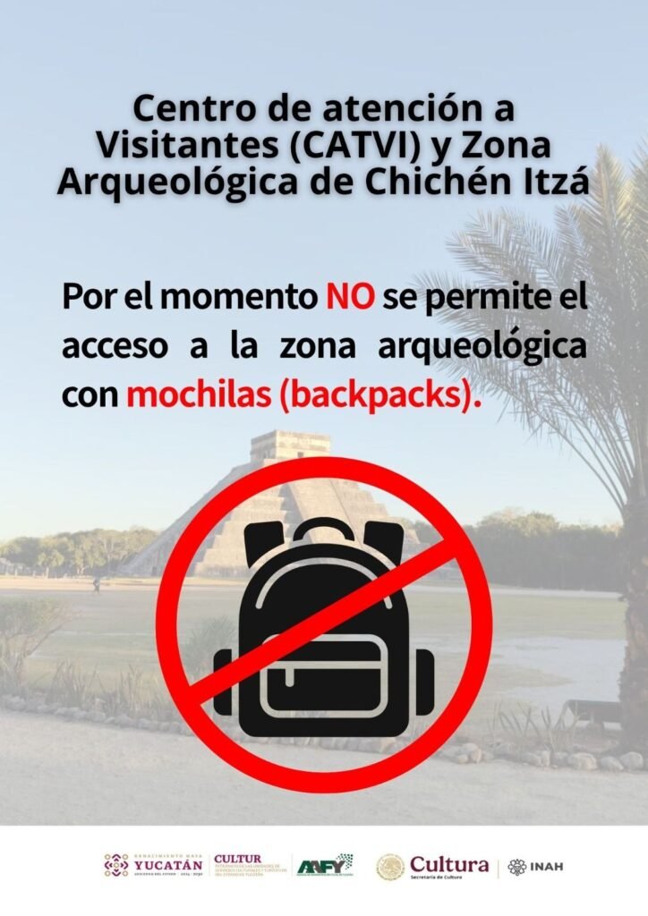 “Con el objetivo de fortalecer la seguridad, mejorar la experiencia de visita y contribuir a la conservación del patrimonio cultural, se informa a todos los visitantes que, a partir de *martes 21 de abril* queda prohibido el acceso con mochilas (backpacks) al interior de la zona arqueológica de Chichén Itzá.