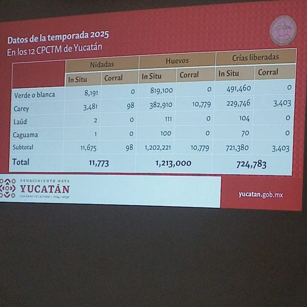 En 2025 se registraron 11 mil 773 nidadas de tortuga blanca, carey, laúd y caguama en la costa yucateca, con cerca de un millón 213 mil huevos, y se liberaron 724 mil 783 crías.