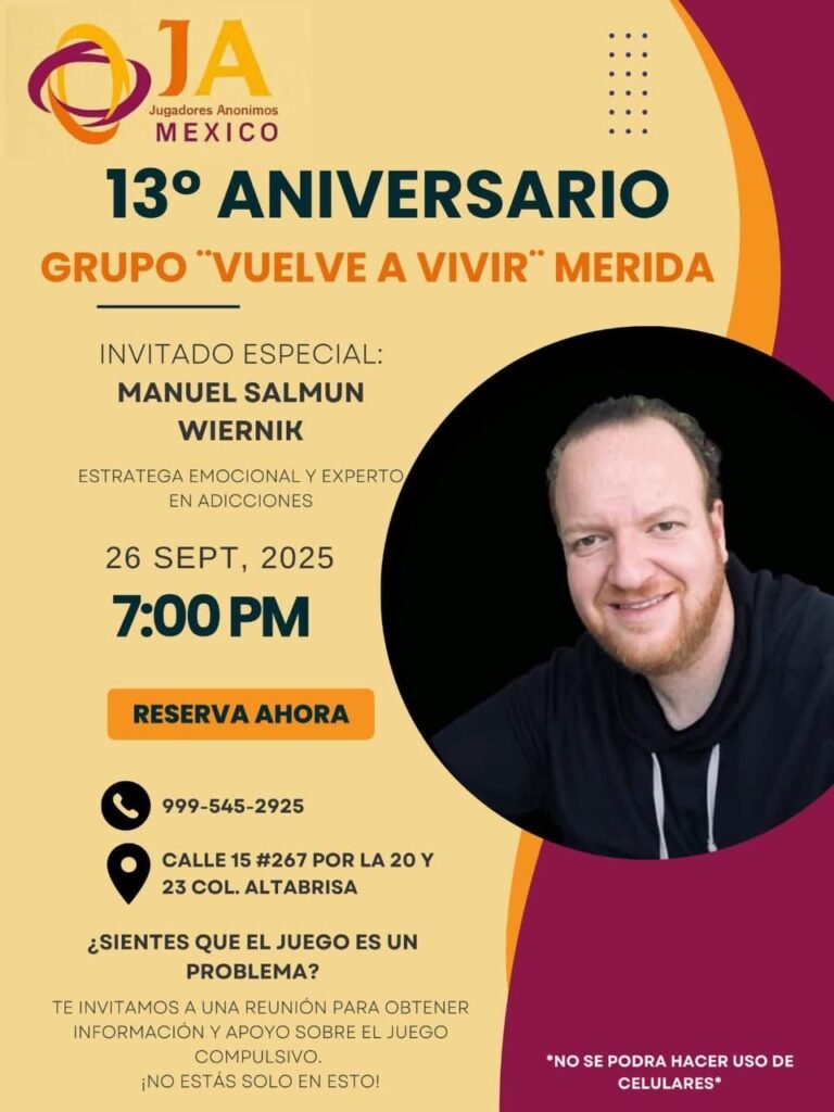 Mérida, Yucatán.- Con 13 años de presencia y labor ininterrumpida en Mérida, el Grupo Jugadores Anónimos “Vuelve a Vivir” conmemora aniversario este 26 de septiembre.